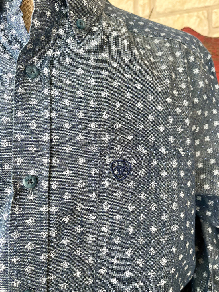 Men's Ariat Shirt Navy Floral Button-Down in navy floral pattern, featuring Greater Arm Mobility™ Technology with classic fit and hidden pen pocket – 10054087. Available at Blair's Western Wear, Marble Falls, TX.
