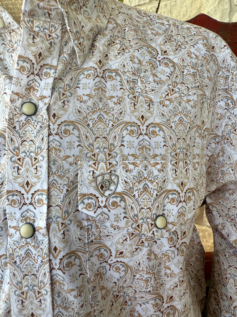 • Subtle tan and gray scroll print that offers a polished look for both casual wear and dressier western occasions.