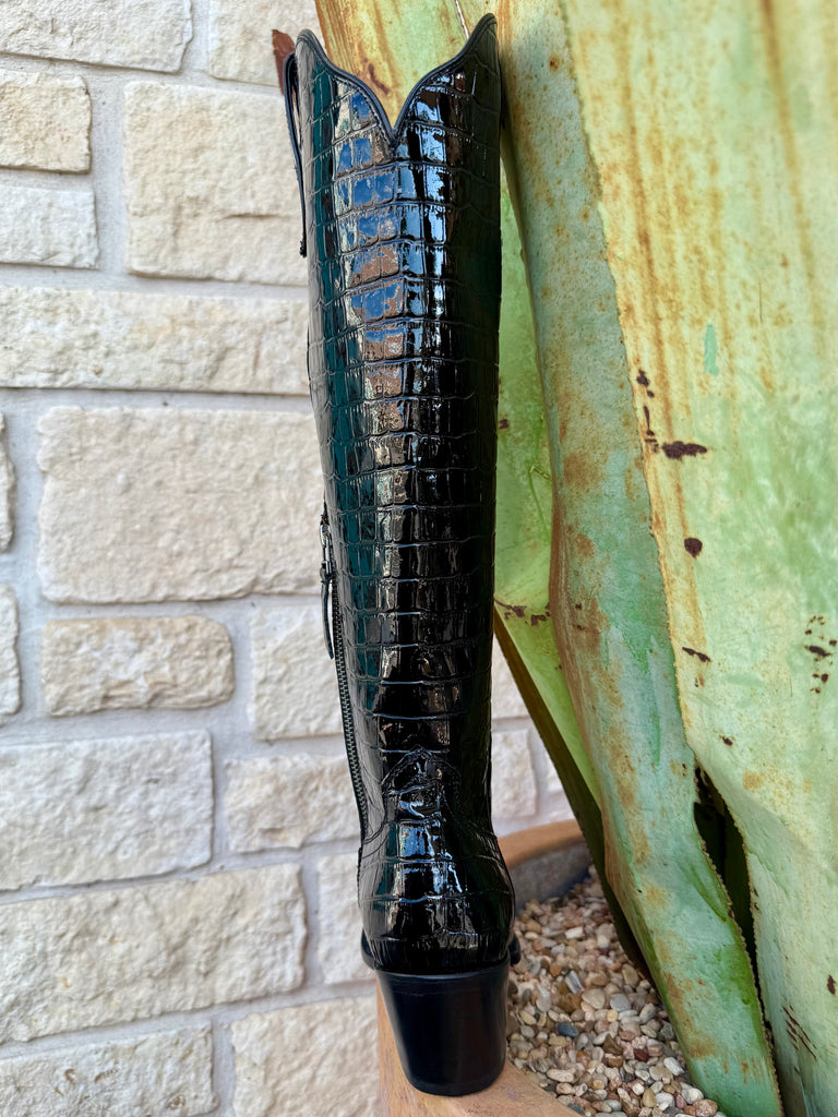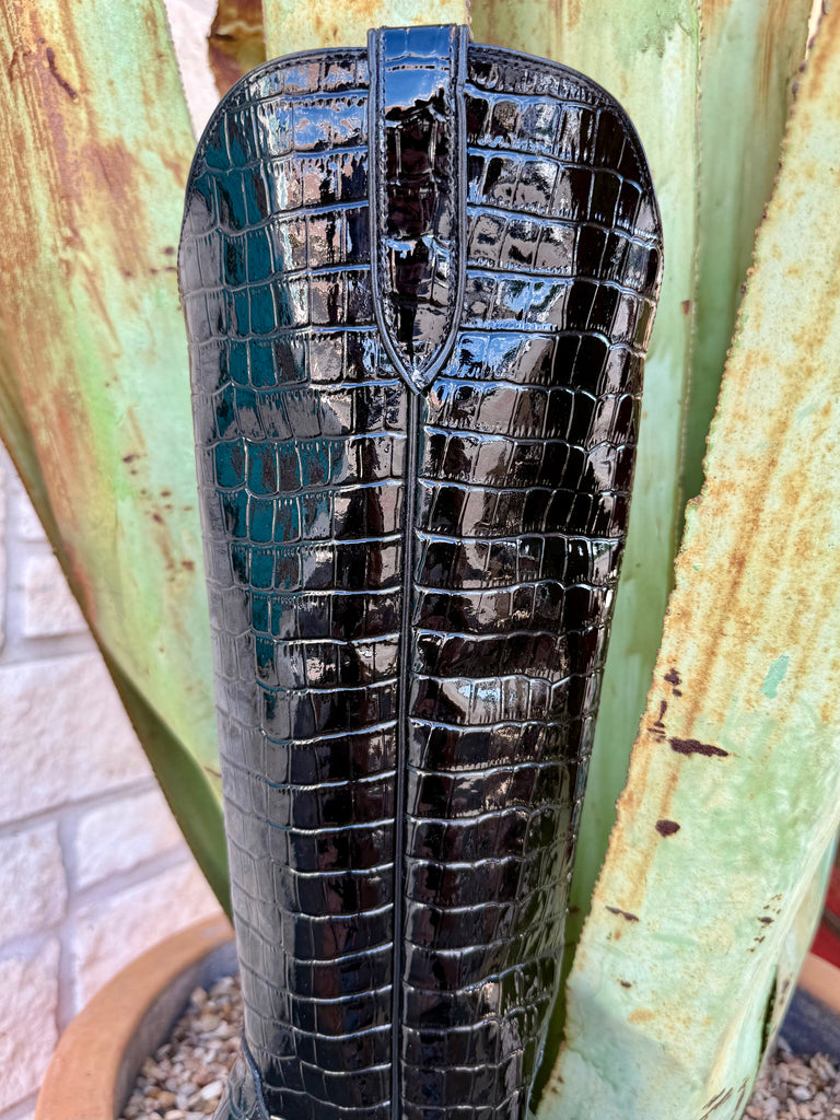 Women’s Ariat Casanova black croc print Western boot, crafted from premium leather with a tall 16” shaft, snip toe, and inside zipper for easy wear – 10063992. Available at Blair's Western Wear, Marble Falls, TX.