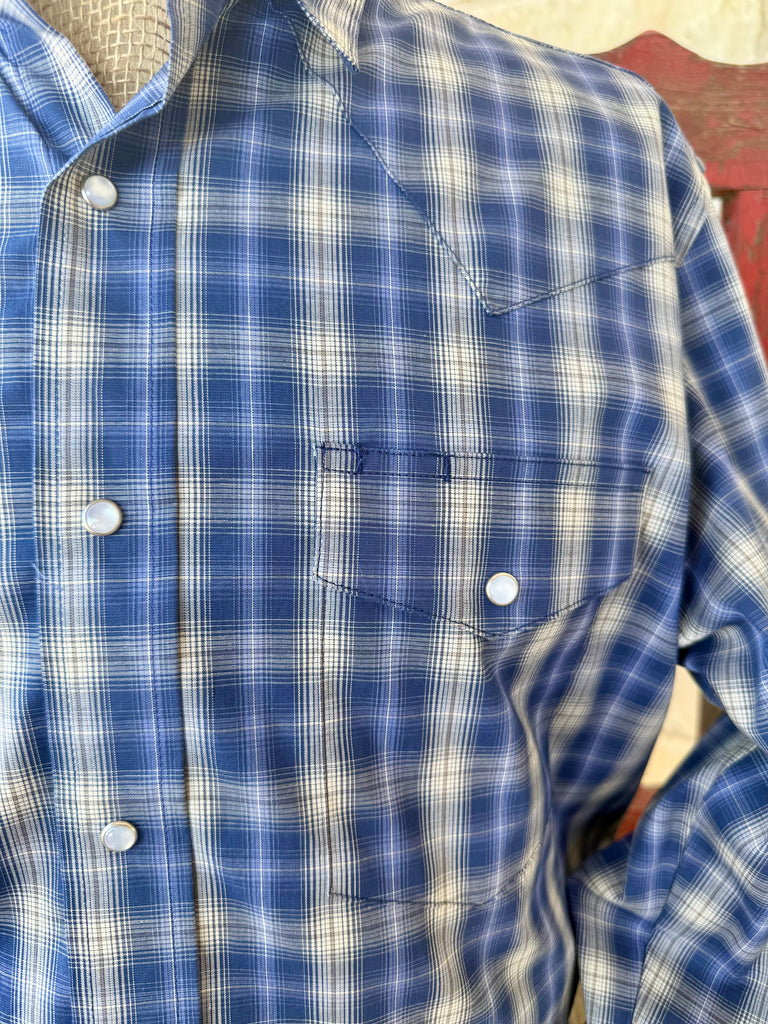 Men’s Wrangler Western plaid long sleeve snap shirt in blue and white, featuring wrinkle-resistant cotton blend fabric with double snap pockets and Western yokes – 112369434. Available at Blair’s Western Wear, Marble Falls, TX.