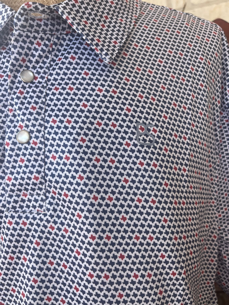 All-over navy and white geometric print accented with red Texas icons for a bold, local-pride style.