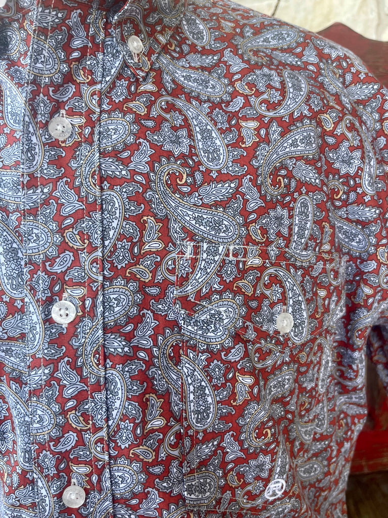Brick red base with gray paisley print for a sharp, eye-catching Western look.