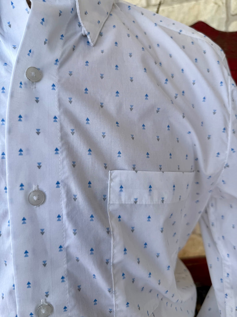 White base with subtle blue geometric print adds a modern twist to a classic western look.