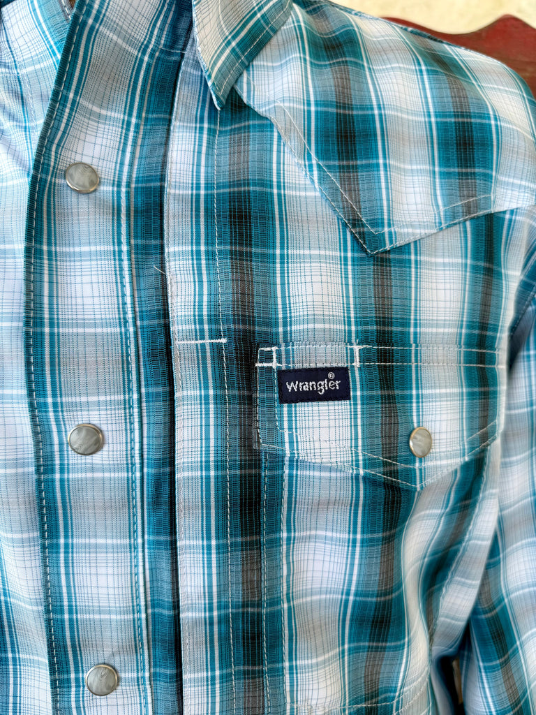 Men’s Wrangler Plaid Teal/White Long Sleeve Snap Shirt – 112368292