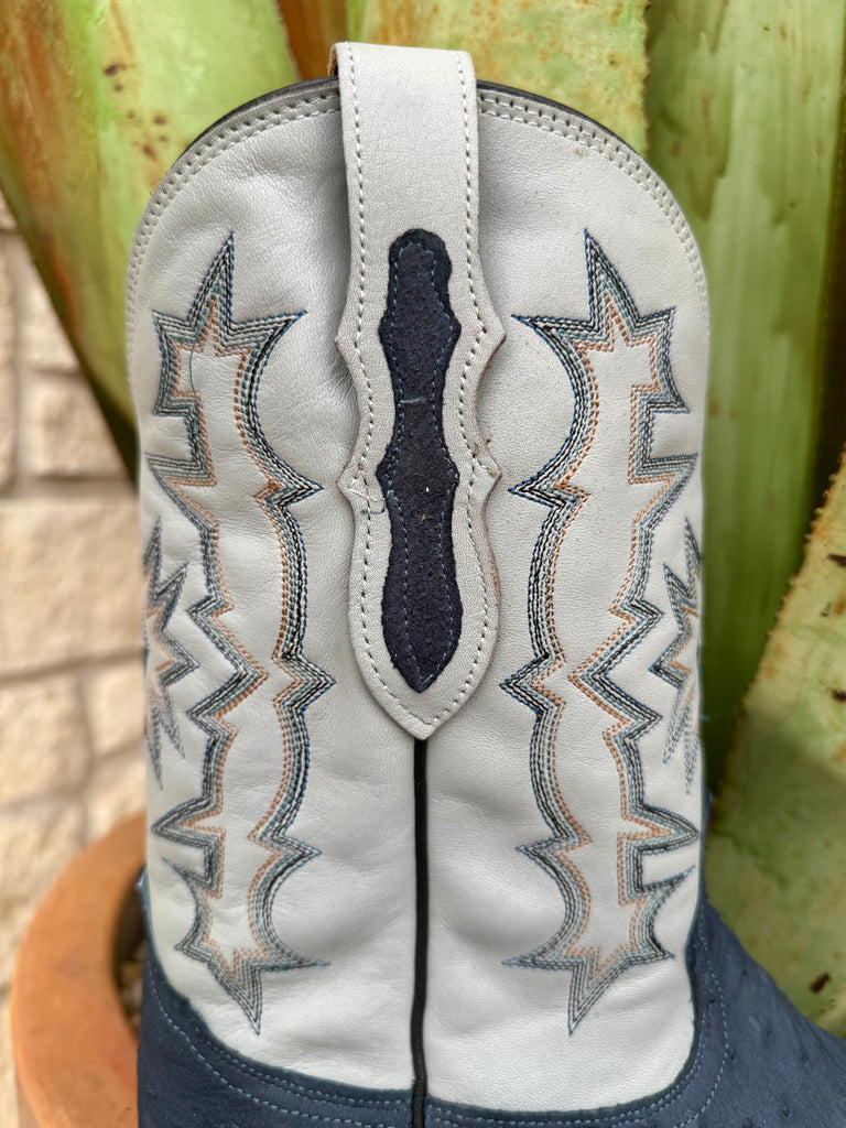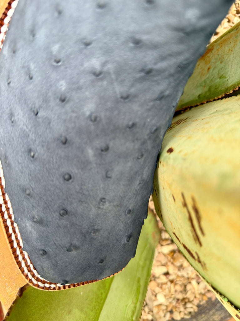 Rich blue ostrich vamp provides natural texture and visual depth, making each pair unique while elevating everyday western style.