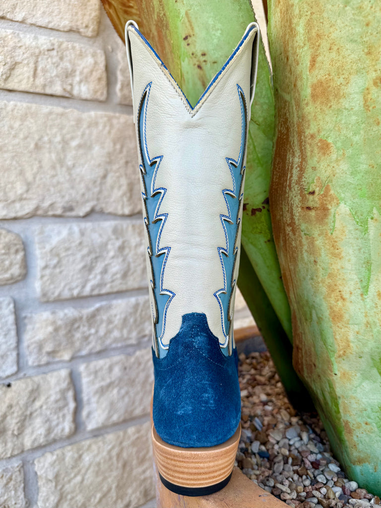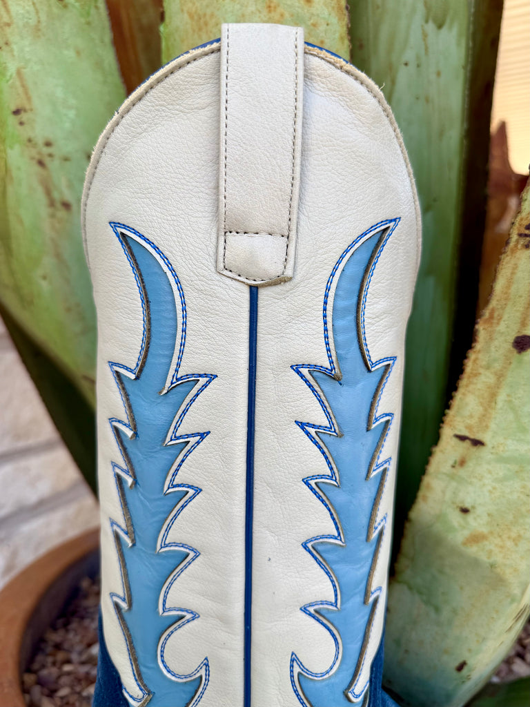 Women’s Macie Bean western boot with blue suede vamp and cream leather cutter-style shaft, built with a leather outsole and supportive stacked heel – M9521. Available at Blair's Western Wear, Marble Falls, TX.