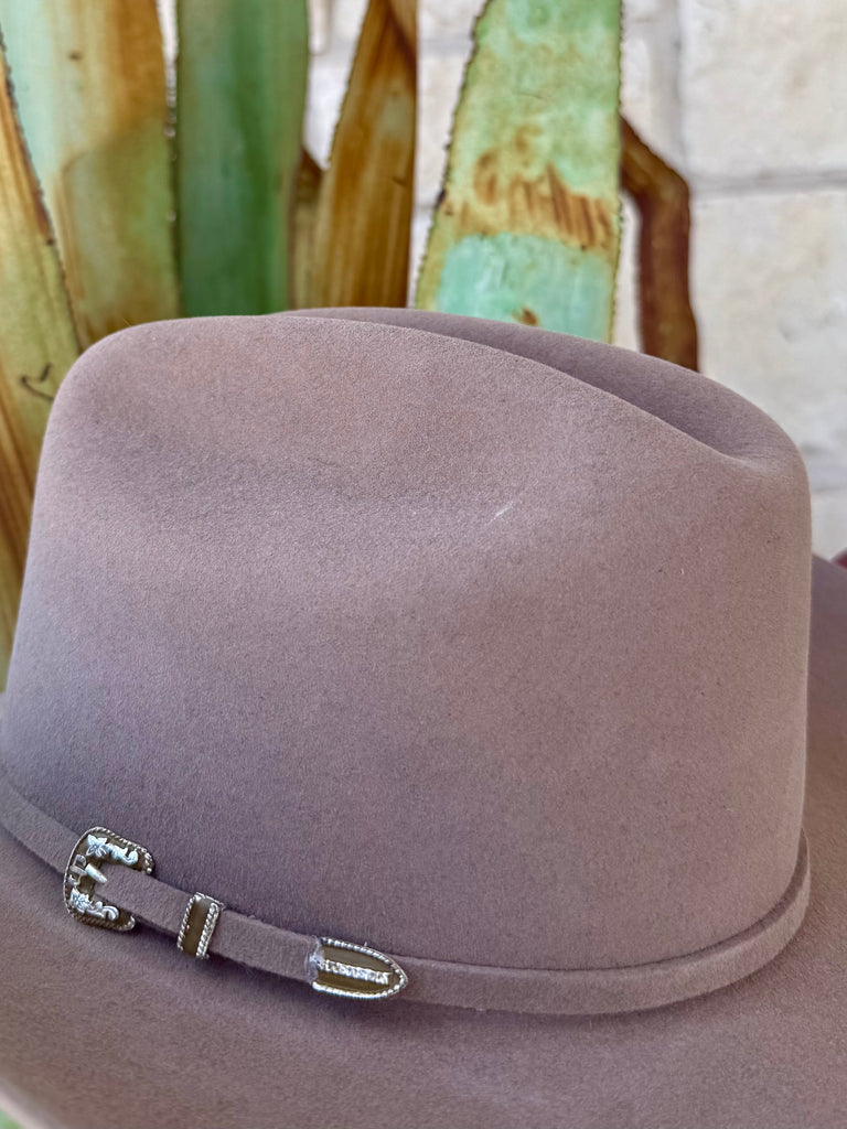 Matching felt hatband finished with a three-piece silver-tone buckle set for authentic Western detailing.