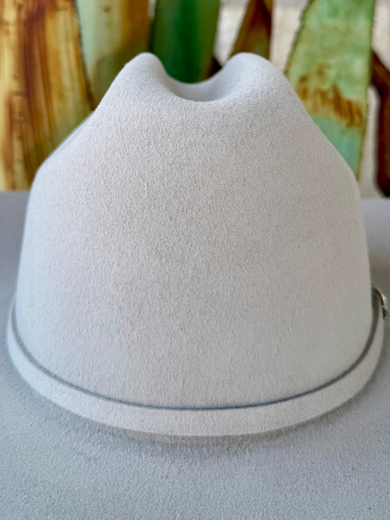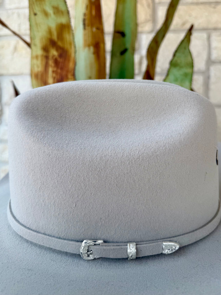 Slim matching felt hatband with silver three-piece buckle set for a polished finish.