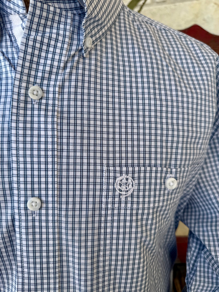 Timeless blue and white check pattern pairs effortlessly with denim or dress jeans for versatile Western-inspired styling.