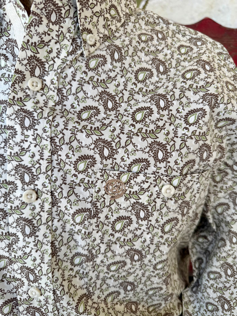 • Allover paisley print in cream, brown, and soft green tones delivers classic Western style with added visual interest that stands out without feeling loud.