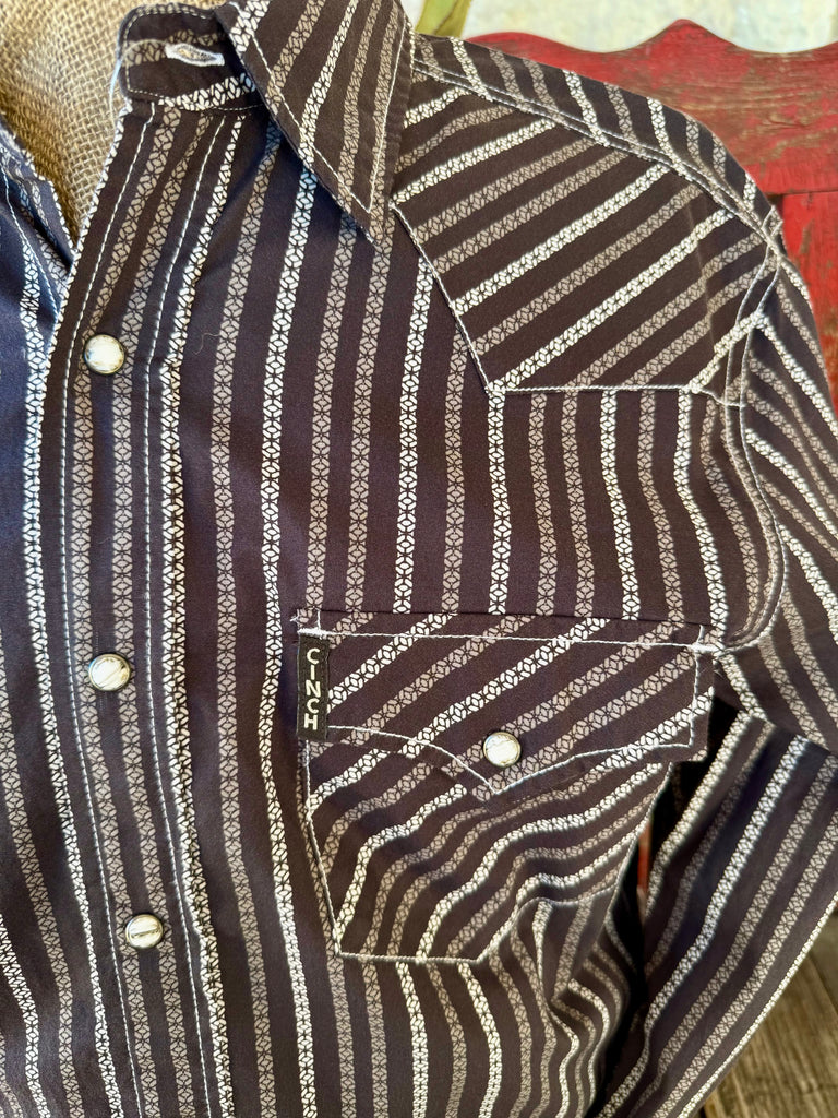 Vertical chocolate and white print creates a clean, elongating look that pairs easily with denim or dressier Western trousers.