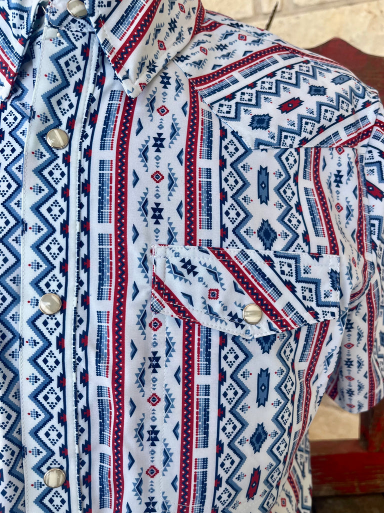 Striking white, red, and blue Aztec pattern for a bold and classic Western vibe