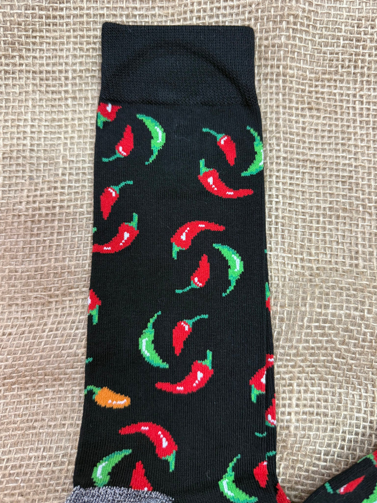 Fun chili pepper pattern in red, green, and orange adds a bold, playful style to everyday wear.