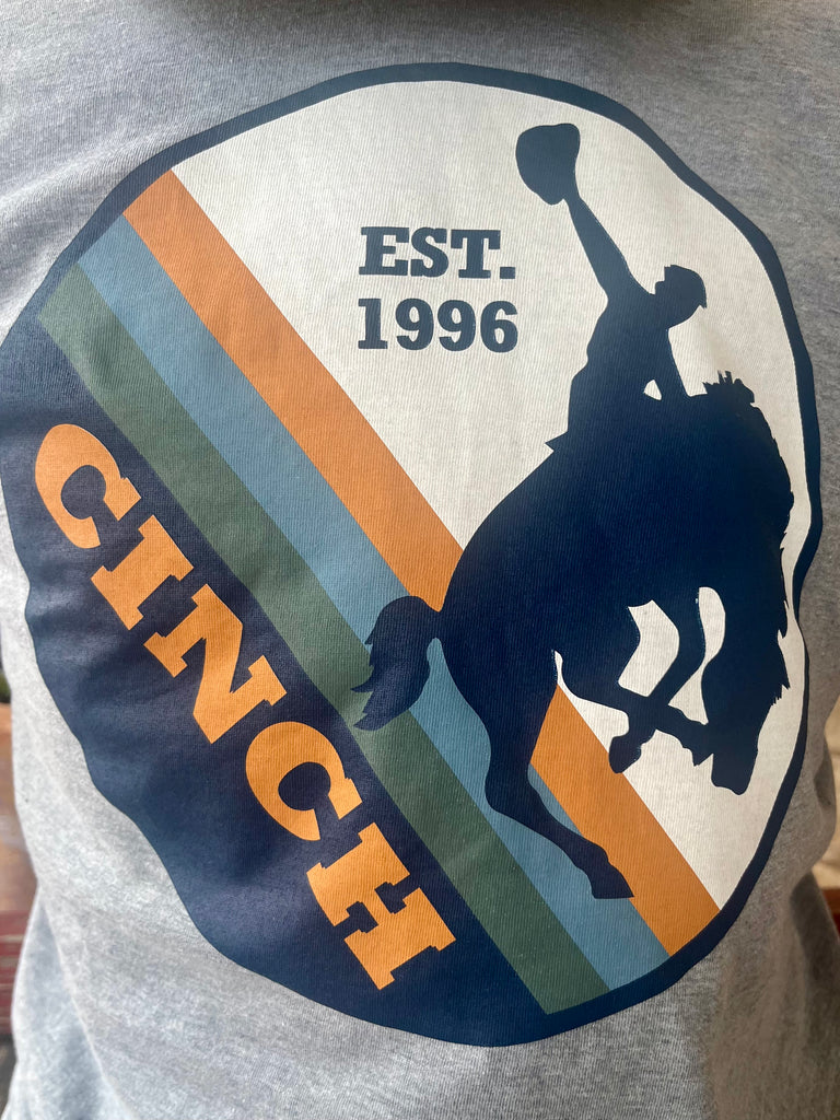 Men's Cinch T-Shirt Grey Bronc Logo in cotton-polyester blend for breathable comfort, featuring a bold bucking bronc front screen print for standout Western style - MTT1690665. Available at Blair's Western Wear, Marble Falls, TX.