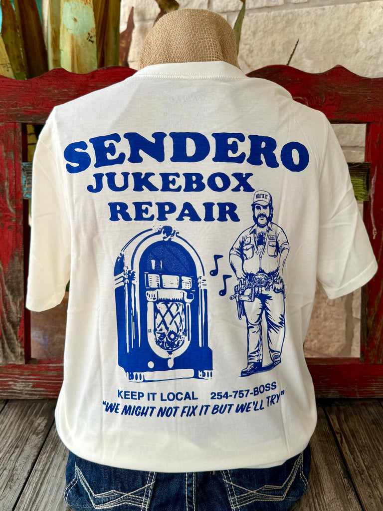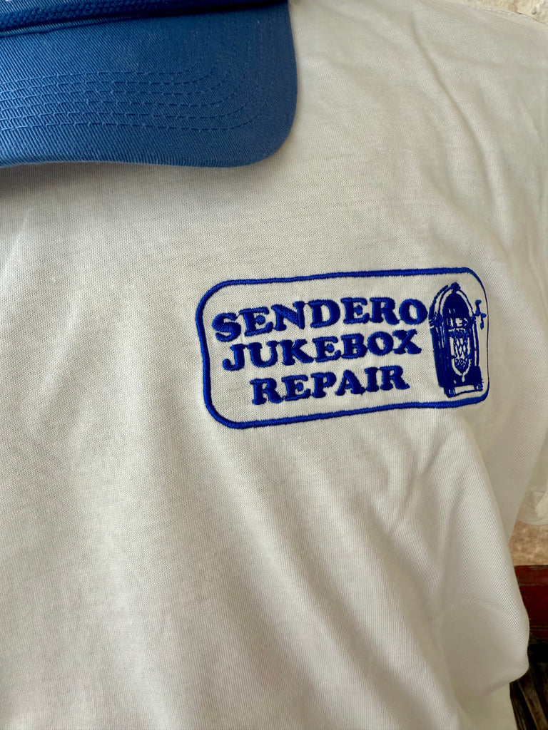 Small chest logo with “Sendero Jukebox Repair” for a subtle workwear style.