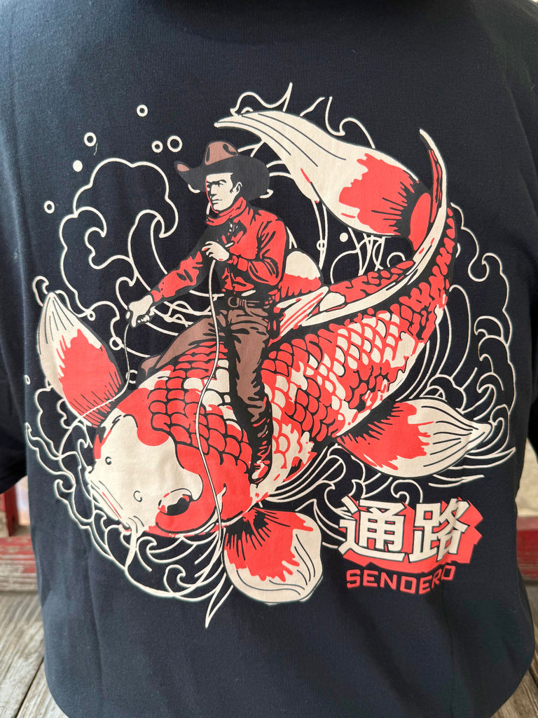 Large back graphic featuring a cowboy riding a koi fish, combining Western style with artistic flair.