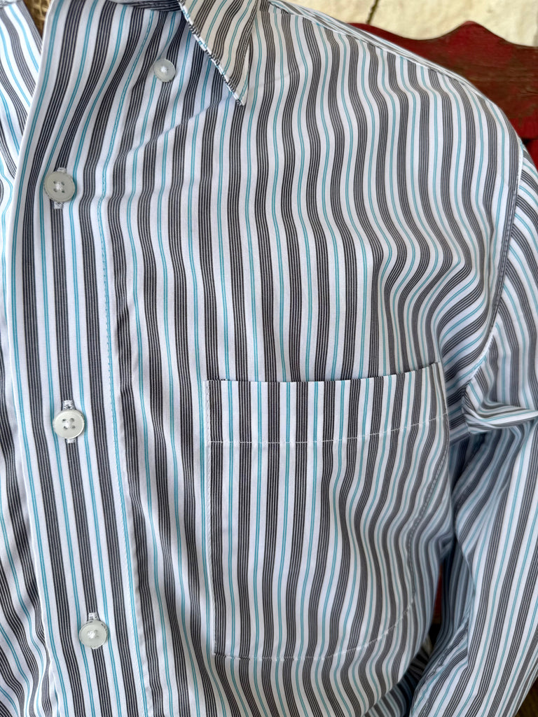 Crisp white base with teal and black vertical stripes that create a sharp, versatile look for both casual and dress wear.