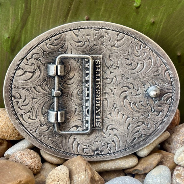 Features: This silver-tone Montana Silversmiths Buckle features a distinctive oval design with a classic western filigree and a prominent longhorn motif at the center. The design is accentuated with barbed wire and twisted rope details along the edges, and the piece is constructed from silver plate over a solid cast metal alloy base. It fits a standard 1.5-inch belt swivel, making it versatile for different belt sizes.