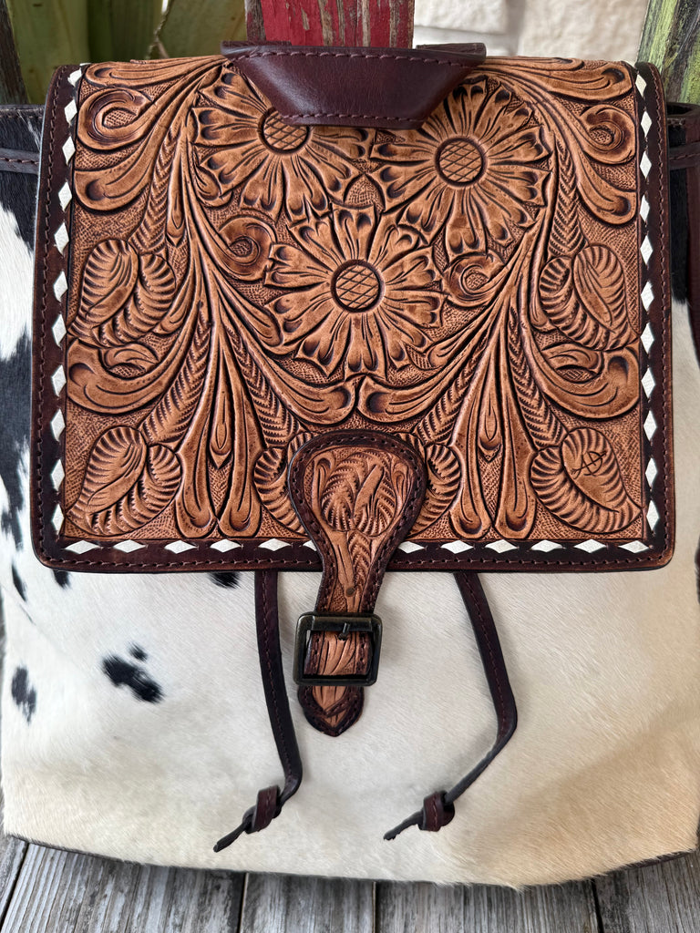 American Darling backpack cowhide and tooled leather backpack in brown, white, and tan, featuring a genuine hair-on cowhide body for a unique pattern and a hand-tooled floral leather flap for authentic Western style - ADBGZ102TAW. Available at Blair's Western Wear, Marble Falls, TX.