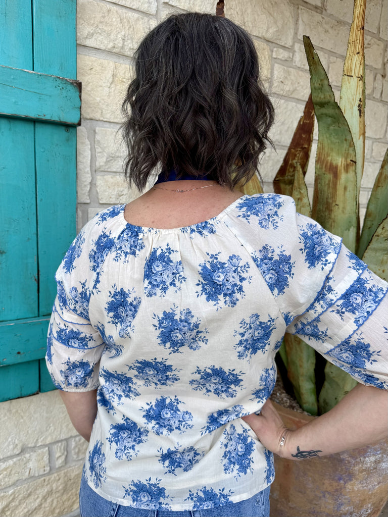 Cream base with soft blue floral print for a fresh, timeless look that pairs effortlessly with denim