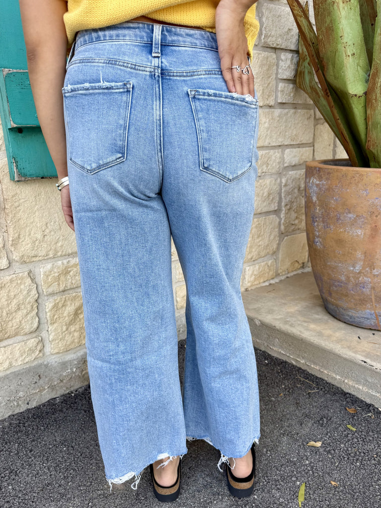 Ladies Light Wash Distressed Wide Leg Jeans - F6001