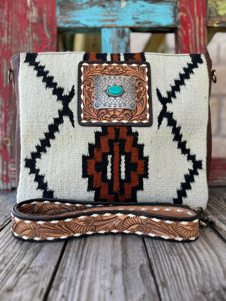 Bring western charm and everyday utility together with this American Darling handbag. Featuring a woven blanket-style body with bold black and rust patterning and a decorative tooled leather buckle plate with turquoise accent, this handbag blends rugged character and stylish details. The back side is constructed in supple brown leather and includes dual zip pockets for easy access. The detachable & adjustable tooled-leather strap lets you wear it crossbody or carry it by hand.