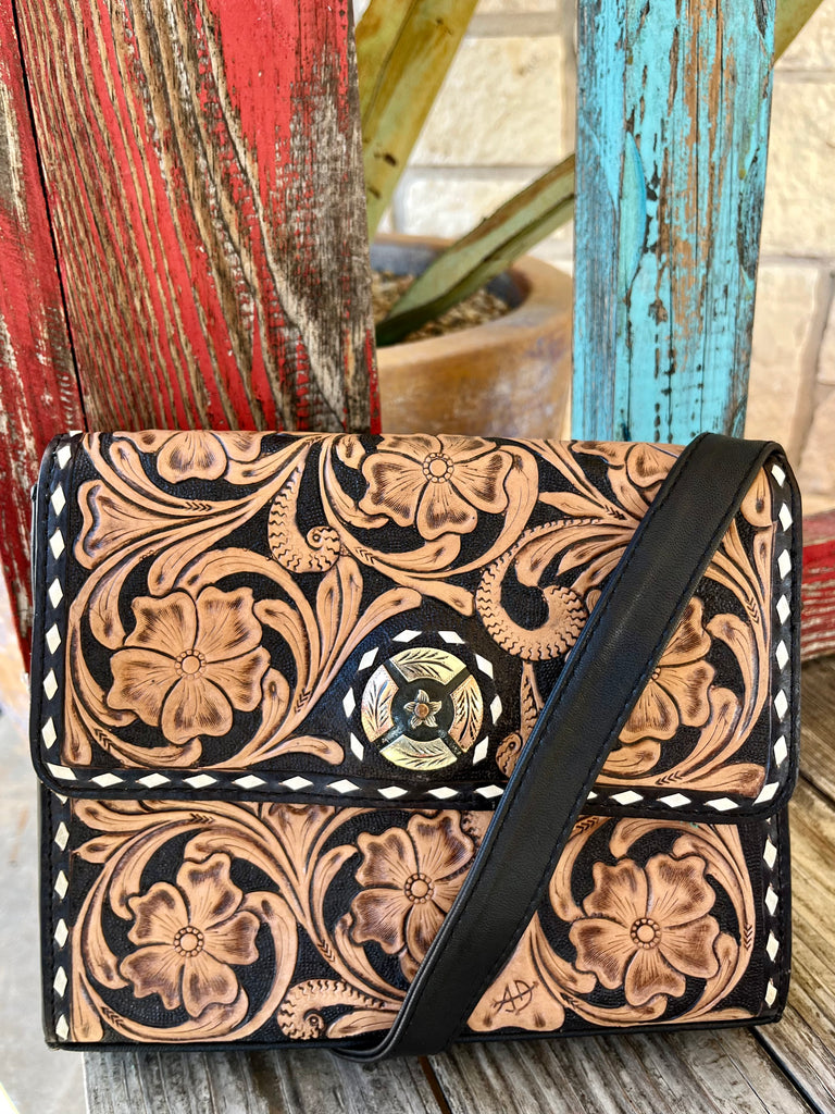Women's American Darling Handbags Black Tooled Flap Purse - ADBG1494