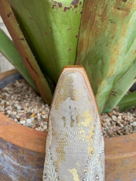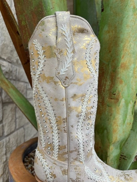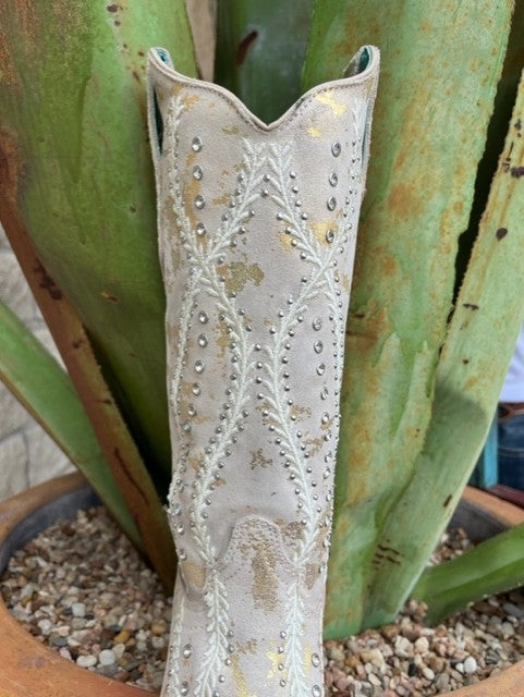 The fashionable 13-inch shaft camel color leather decorated with intricate white embroidery and crystals will go perfectly with your favorite sundress, denim, and wedding dress.