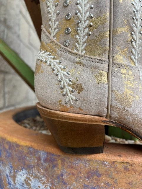 Intricate, feminine, and beautiful. Grab everyone's attention with this beautifully decorated crystal and embroidery boot.