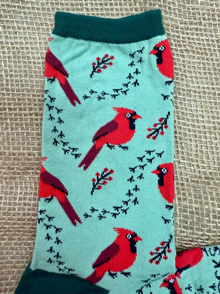 Playful cardinal and berry design adds a pop of color and personality to any outfit.